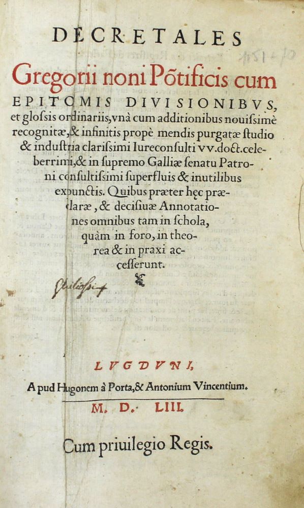 Decretales Gregorii noni Pontificis cum epitomis divisionibus, et glossis ordinariis, unà cum additionibus nouissimè recognitae, & infinitis propè mendis purgatae studio & industria clarissimi Iureconsulti vv.doct.celeberrimi, & in supremo Galliae senatu Patroni consultissimi superfluis & inutilibus expunctis. Quibus praeter haec praeclarae, & decisiuae annotationes omnibus tam in schola, quàm in foro, in theorea & in praxi accesserunt. Lugduni (= Lyon), apud Hugonem à Porta, & Antonium Vincentium, 1553.