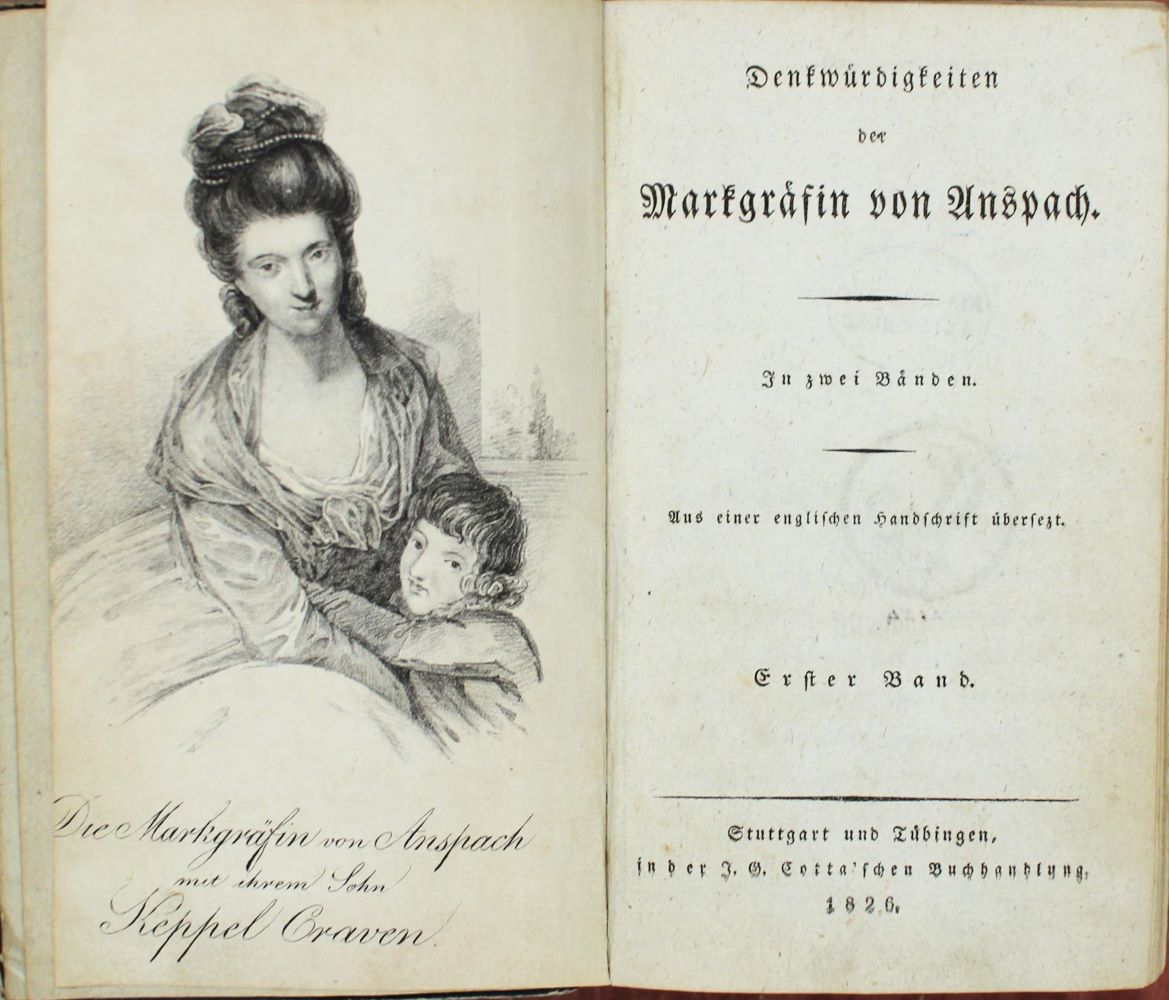 Denkwürdigkeiten der Markgräfin von Anspach. Aus einer englischen Handschrift übersetzt. 2 Bde. (in 1 Band gebunden). Stuttgart und Tübingen, in der J. G. Cotta’schen Buchhandlung, 1826.