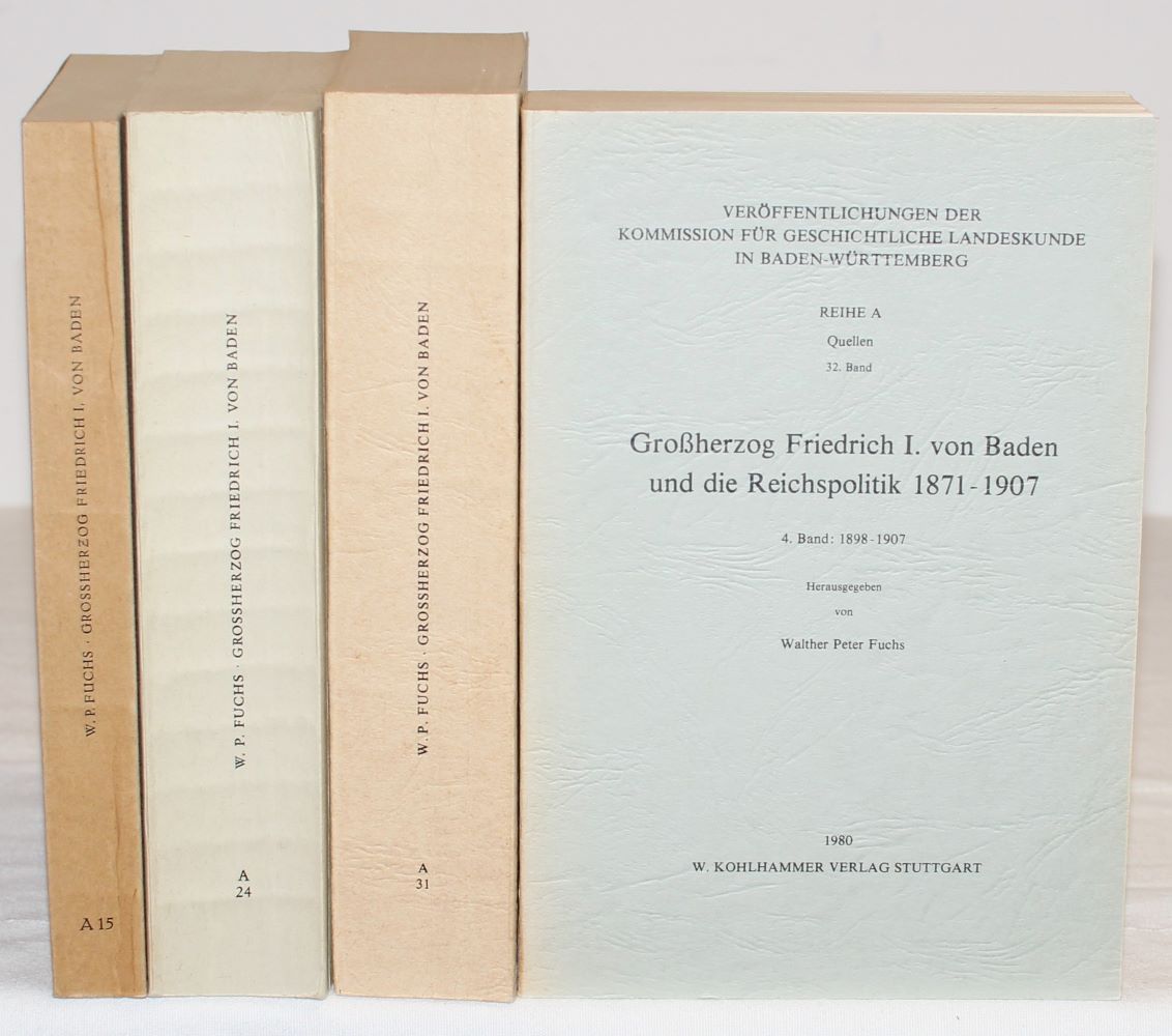 Eines der Hauptwerke von Fuchs (1905-1997), der 1930 bei Wilhelm Mommsen in Marburg promoviert wurde und sich 1936 bei Günther Franz an der Universität Heidelberg habilitierte. Im Jahre 1953 wurde er als Professor für Geschichte an die TH Karlsruhe berufen, im Jahre 1957 zugleich als Honorarprofessor an die Universität Heidelberg. Neben Großherzog Friedrich I. von Baden gehörten vor allem reformationsgeschichtliche Themen und Arbeiten über Leopold von Ranke zu seinen bevorzugten Forschungsinteressen. Im Jahre 1962 folgte er einem Ruf an die Universität Erlangen-Nürnberg. An der Universität Heidelberg war Helmut Kohl Doktorand bei Walther Peter Fuchs, bei dem er im Jahre 1958 promovierte. – I. 1871-1879; II. 1879-1890; III. 1890-1897; IV. 1898-1907. – Bd. 3 mit handschriftlicher Widmung des Herausgebers auf Vorsatz.