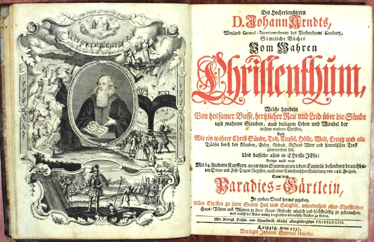 Sämtliche Bücher Vom Wahren Christenthum, welche handeln von heilsamer Busse, hertzlicher Reu und Leid über die Sünde und wahrem Glauben, auch heiligem Leben und Wandel der rechten wahren Christen, auch wie ein wahrer Christ Sünde, Tod, Teufel, Hölle, Welt, Creutz und alle Trübsal durch den Glauben, Gebet, Gedult, Gottes Wort und himmlischen Trost überwinden soll, und dasselbe alles in Christo Jesu: Anietzo aufs neue mit 64 saubern Kupffern, accuraten Summarien ieden Capitels, besonders brauchbaren Sonn- und Fest-Tages-Register, auch einer Catechetischen Einleitung von 288 Fragen samt dem Paradies-Gärtlein, in groben Druck heraus gegeben, allen Christen zu ihrer Seelen Heil und Seligkeit, insonderheit allen christlichen Haus-Vätern und Müttern zu ihrer Haus-Andacht nützlich und höchstnöthig zu gebrauchen, weil nächst der Bibel wenig dergleichen erbauliche Bücher zu finden. Leipzig, verlegts Johann Samuel Heinsius, 1737.