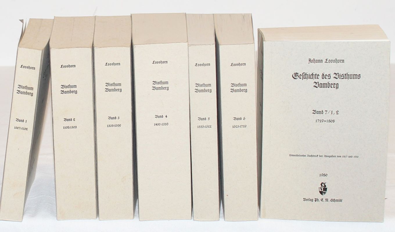 Nachdruckausgabe des Standardwerks. – Looshorn (geb. 1831 in Weidenhüll bei Elbersberg, gest. 1916 in Bamberg) war Pfarrer und Historker. – I. Gründung und I. Jahrhundert des Bisthums Bamberg. Oder: Die Heiligen Kaiser Heinrich und Kunigunda. (1886, ND 1981). VIII, 544 S.; II. Der heilige Bischof Otto. Festschrift zum 700jährigen Jubiläum seiner Heiligsprechung. (1888, ND 1981). 918 S.; III. Das Bisthum Bamberg von 1303-1399. (1891, ND 1981). VIII, 775 S.; IV. Das Bisthum Bamberg 1400-1556. (1900, ND 1980). VIII, 1066 S., 2 Bll. (Inhalt); V. Das Bisthum Bamberg von 1556-1622. (1903, ND 1980). VI, 532 S., 3 Bll. (Inhalt); VI. Das Bisthum Bamberg von 1623-1729. (1906, ND 1980). 719 S., 3 Bll. (Inhalt); VII. (2 Teilbde. in 1 Band). 1. Graf Friedrich karl von Schönborn als Fürstbischof von Bamberg 1729-1746. Festschrift zur neunten Säkular-Feier des Bisthums Bamberg. Mit 9 autoypirten Bildern. (1907, ND 1980). VIII, 311 S., 1 Bl. (Inhalt), 2. Das Bisthum Bamberg von 1747-1808. (1910, ND 1980). VII, 757 S., 3 Bll. (Inhalt).