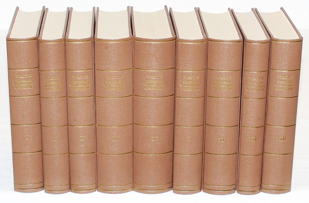 Im Format verkleinerter Nachdruck, handliches Bibliotheks- und Arbeitsexemplar. – Waitz (1813-86) studierte Jura und Geschichte, u. a. bei Ranke. 1836 zum Dr. phil. promoviert, begann er im gleichen Jahr noch seine Mitarbeit an der „Monumenta Germaniae Historiae“, die bis 1842, seinem ersten Lehrstuhl in Kiel, andauerte. Im Jahre 1849 wechselte er auf einen Lehrstuhl nach Göttingen, 1875 ging er erneut nach Berlin, um als Leiter der Zentraldirektion die „Monumenta“ zu betreuen (bis 1886). Waitz war 1848/49 Mitglied der Frankfurter Nationalversammlung. – I. Die Verfassung des deutschen Volkes in ältester Zeit; II-IV. Die Verfassung des Fränkischen Reichs; V-VIII. Die deutsche Reichsverfassung von der Mitte des neunten bis zur Mitte des zwölften Jahrhunderts.