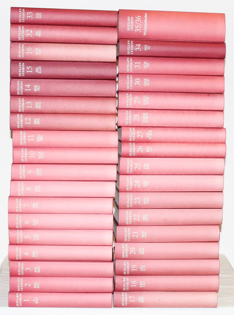 Quellenlexikon zur deutschen Literaturgeschichte. Bibliography of Studies on German Literary History. Personal- und Einzelwerkbibliographien der internationalen Sekundärliteratur 1945-1990 zur deutschen Literatur von den Anfängen bis zur Gegenwart. Zugleich 3., überarb., wesentl. erw. und auf den neuesten Stand gebrachte Aufl. des “Quellenlexikons der Interpretationen und Textanalysen”. Bibliographische Mitarbeit von Günter Albrecht, Dietrich Aßmann, Paolo Chiarini, Antal Mádl, Dae-Hwan Park, Anna Stroka, Teruaki Takahashi u.v.a. Bd. 35/36 mit dem Werktitelindex (Wer schrieb welches Werk? Ein Titelbuch der deutschen Literatur und Geistesgeschichte). 36 Bde. (in 35 gebunden = alles Erschienene). Duisburg, Verlag für Pädagogische Dokumentation, 1994-2003.
