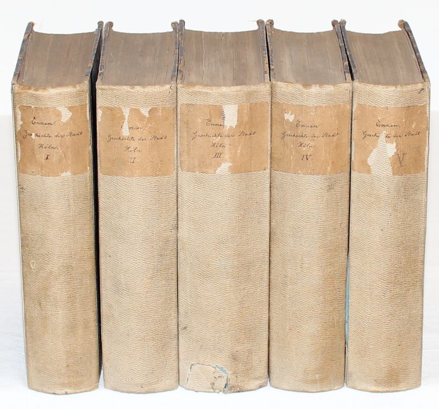 Originalausgabe des Standardwerks zur Kölner Stadtgeschichte, das erst 150 Jahre nach dessen Erscheinen durch eine Neubearbeitung ersetzt wurde. Das Werk wurde während Ennens Zeit als erster hauptamtlicher Leiter des Historischen Archivs der Stadt Köln erarbeitet; der letzte Band erschien in Ennens Todesjahr. Leonard Ennen (1820-1880) studierte 1841-1844 die Theologie an den Universitäten Münster und Bonn – und galt den Historikern deswegen oft als Dilettant. Nach dem Studium besuchte Ennen das Priesterseminar in Köln und ließ sich zum Priester weihen. Bereits während seiner Zeit als Kaplan in Königswinter (1845-1857) beschäftigte sich Ennnen intensiv mit der rheinischen Geschichte, was u. a. zu seiner Mit-Gründung des Historischen Vereins für den Niederrhein (1854) führte. Ennen war auch politisch tätig. Im Jahre 1856 wurde er als Abgeordneter der Katholischen Fraktion in das Preußische Abgeordnetenhaus gewählt.