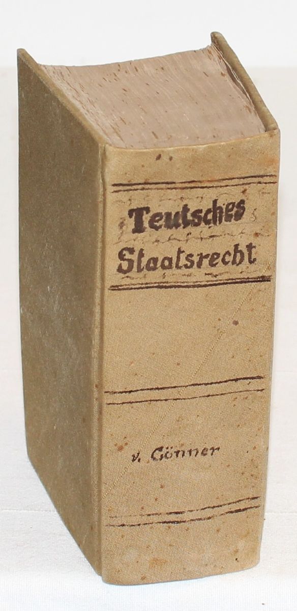 Erste Ausgabe, eine der bekanntesten Schriften Gönners! – „Ein Lehrbuch des teutschen Staatsrechts könnte wohl in keinem günstigeren Zeitpunkt erscheinen, als im gegenwärtigen, wo das Vaterland aus einem harten Kampfe mit Erhaltung seiner politischen Integrität trat“ (vgl. Vorrede, Seite V). Gönner (1764-1827) war Professor in Bamberg (seit 1789), Ingolstadt (seit 1799), Landshut (seit 1800) und München (seit 1826). Er vor allem verfocht die Verlegung der Universität Ingolstadt nach Landshut, die ihrerseits 1826 in der Universität München aufging. Er war Mitglied der Gesetzgebungskommission in München und seinerzeit einer der bekanntesten und bedeutendsten Juristen in Bayern.