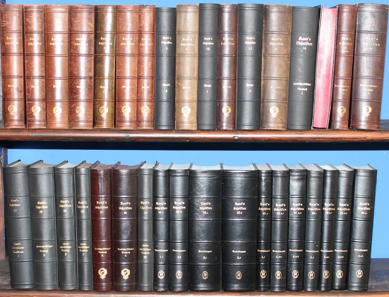 Die wissenschaftlich maßgebliche Akademieausgabe in der jeweils letzten Bearbeitung und der jeweils ersten Ausgabe des Originaldrucks (nur Band 12 in einem späteren Nachdruck). Die ersten 11 Bände erschienen von 1900 bis 1917 noch im Verlag Georg Reimer Berlin. Der Verlag Walter de Gruyter übernahm in Rahmen der neugegründeten ‚Vereinigung der wissenschaftlichen Verleger‘ Anfang der 20er Jahre mit dem Verlag Reimer auch die Akademie-Ausgabe und führt sie bis heute weiter. Die letzte Bearbeitung des Doppelbands 26 durch Reinhard Brandt und Werner Stark datiert auf die Jahre 2009 und 2020, sodass die Arbeit an der Akademieausgabe sich nunmehr über 120 Jahre erstreckt. Die Ausgabe enthält eine Vielzahl an Erstdrucken. Die ab 1910 erschienenen Neudrucke der Bände 1-14 enthalten (in der Regel ohne Hinweise auf dem Titelblatt!) jeweils Korrekturen, Zusätze und Erweiterungen, sodass die hier vorliegenden Bände den bislang endgültigen Stand der akademischen Ausgabe des Kantischen Werkes in den vier Abteilungen ‚Werke, Briefwechsel, handschriftlicher Nachlass und Vorlesungen‘ wiedergeben – nahezu ganz durchgehend in den seltenen Originaldrucken. Es fehlen nur die beiden Bände 26,1 und 29,1,2, mehr ist bislang nicht erschienen.
